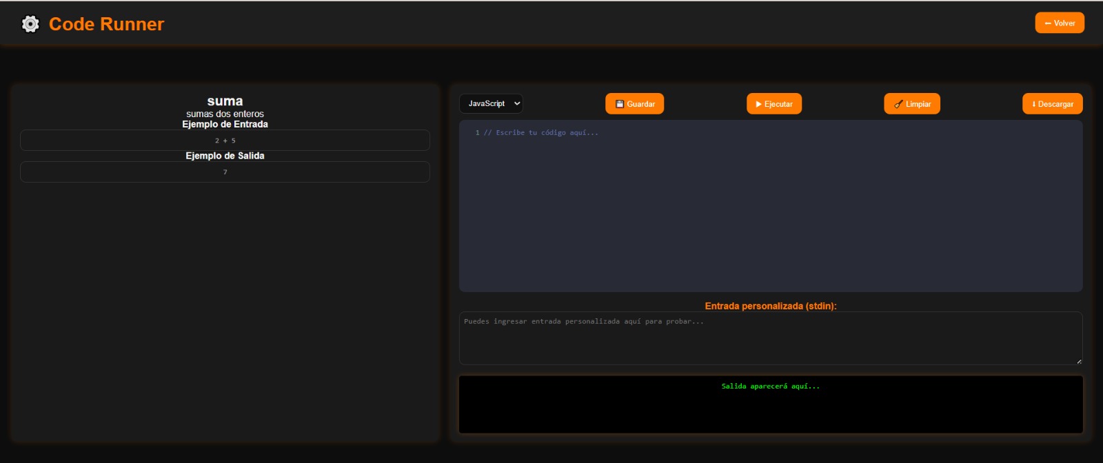 Con este proposito desarrollamos un editor de codigo basado en codemirror y como api judge0, las cuales como habiamos dicho anteriormente nos permite manejar 4 lenguajes de programacion, este editor de codigo cuenta con un parametro de entrada y una salida